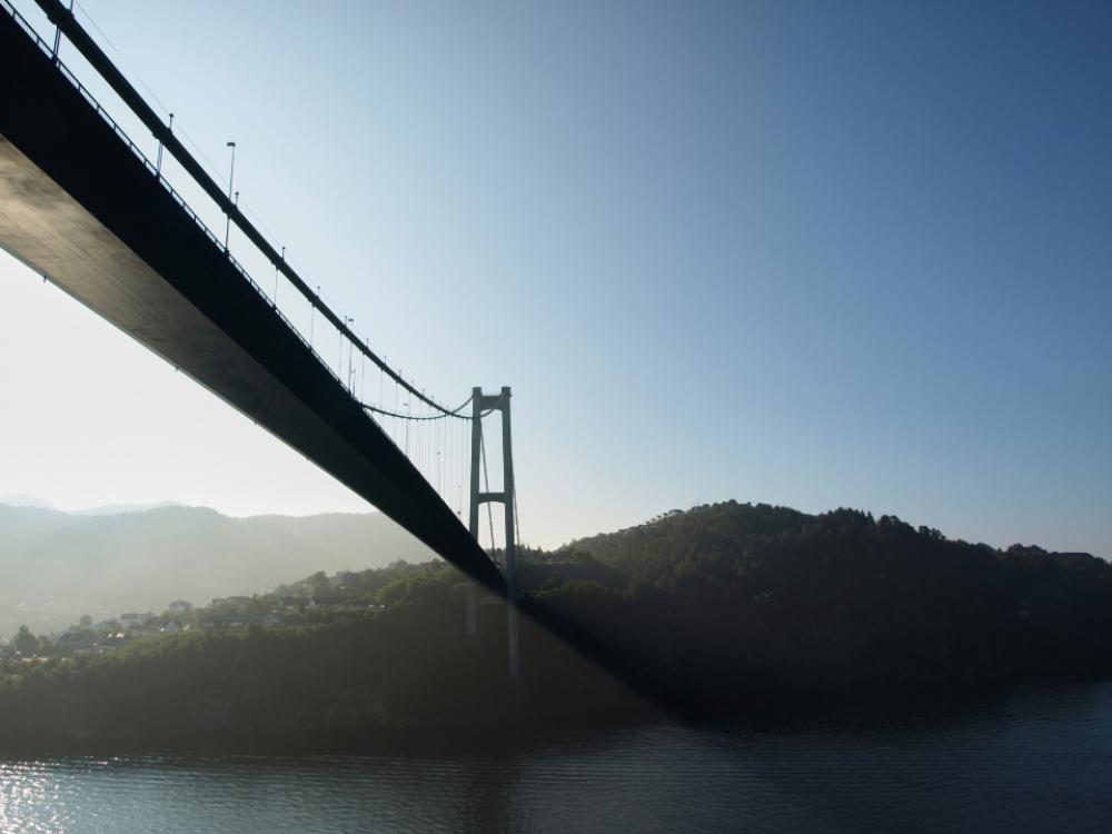 city suspension bridge lake water