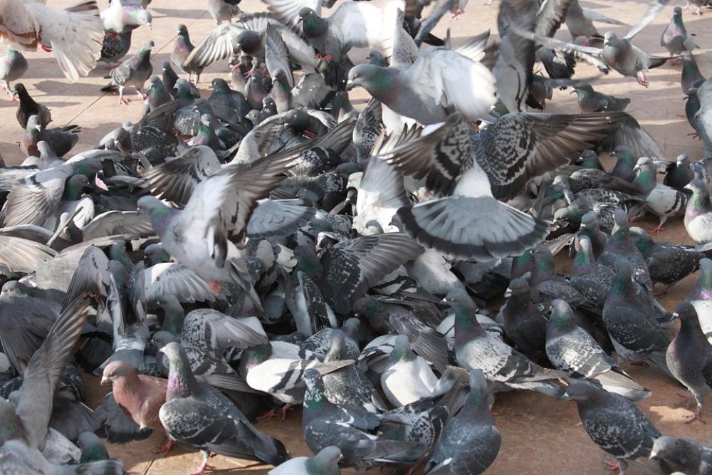 Close-Up Flock Flying Pigeons Square Town Birds