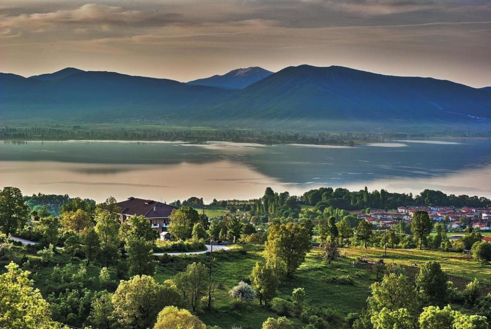 evening village landscape lake