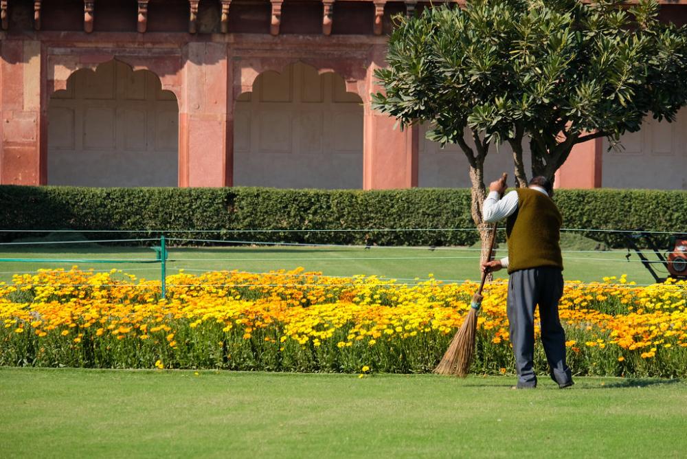 Gardner Sweeping the Leaves to Clean up the Garden