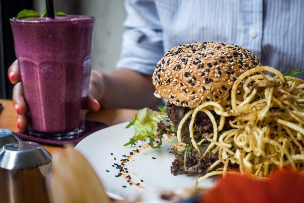 Girl having a vegan burger and smoothie