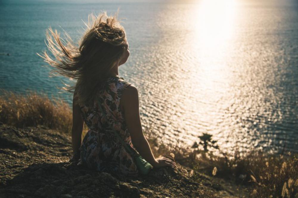 Girl watching sunset and wind playing with her hair