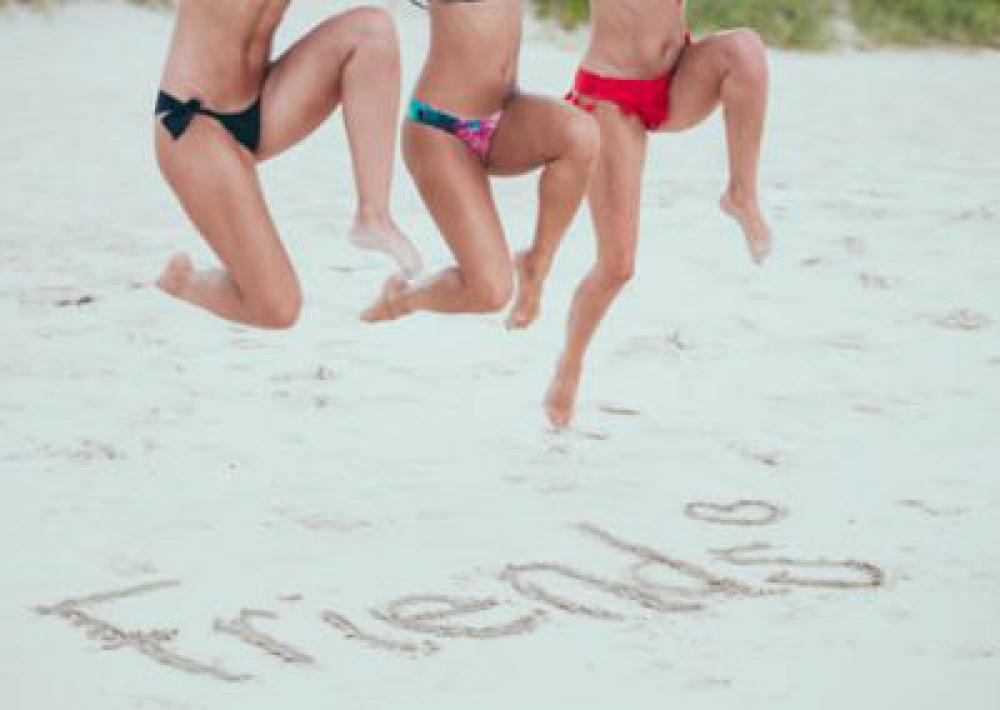 Girls In bikinis Jumping Over Friends On Beach