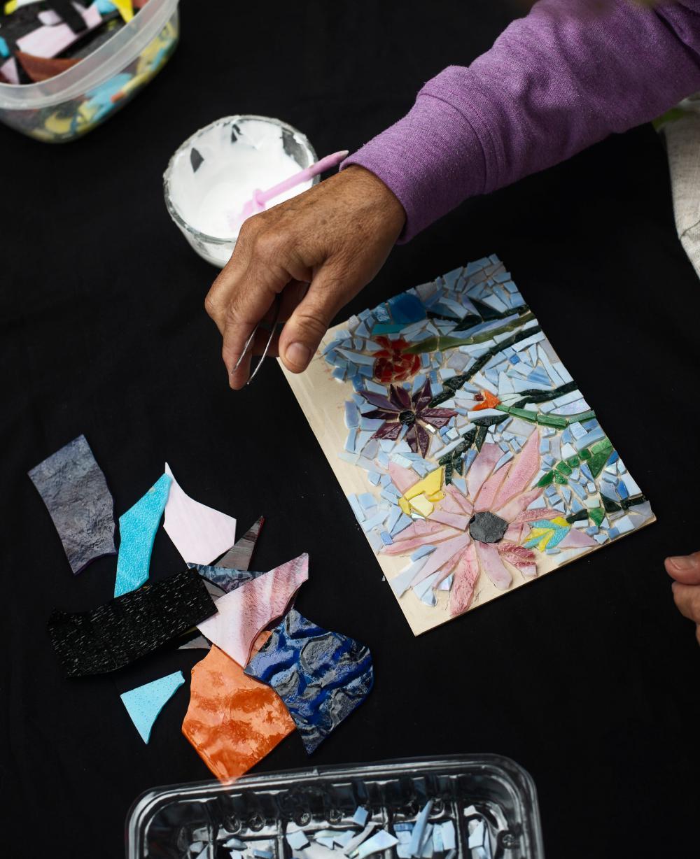 Hand Holds Tweezers Above Glass Mosaic Of Flowers Photo