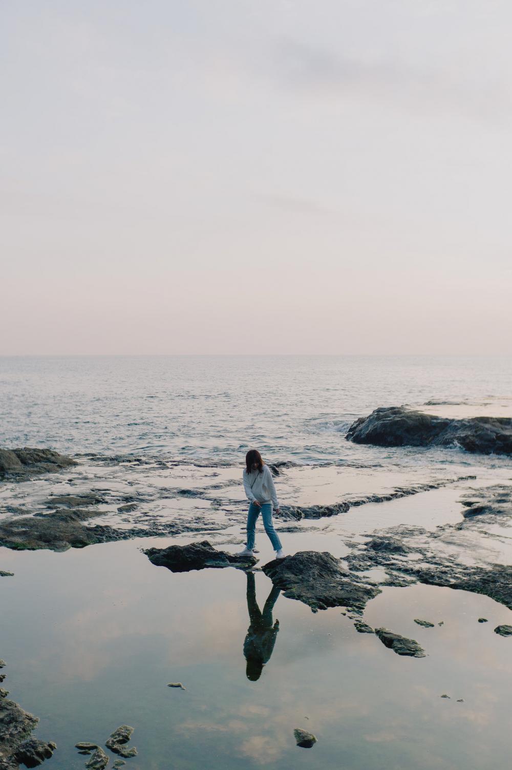 Person Stands On Rocks Poking Out Of The Ocean Shoreline Photo