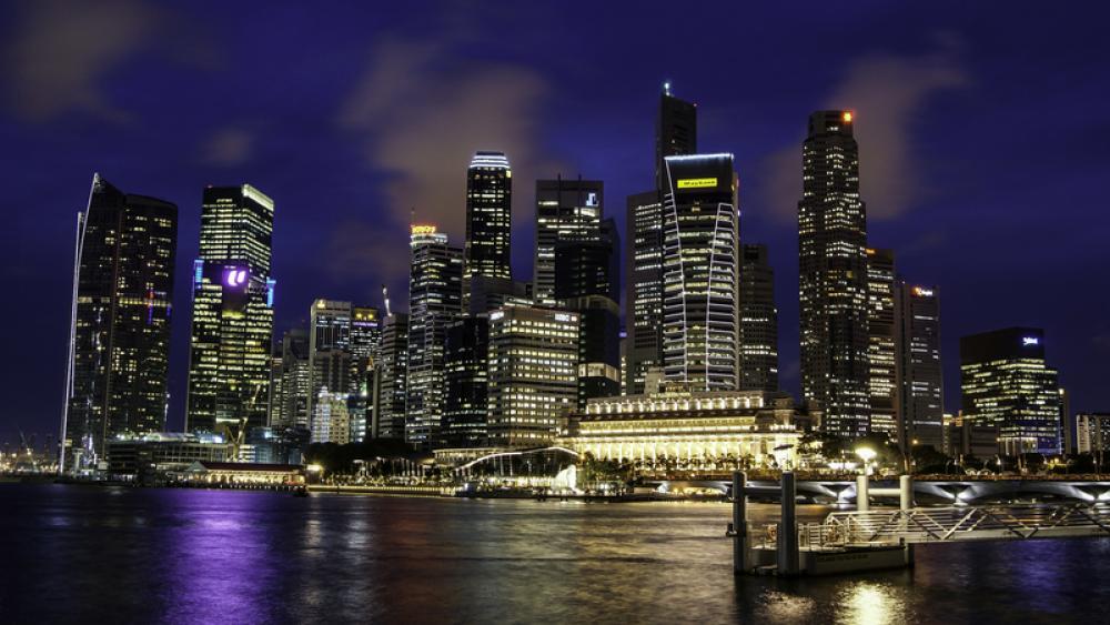 Singapore Skyline with dark blue sky in the background at night free photo
