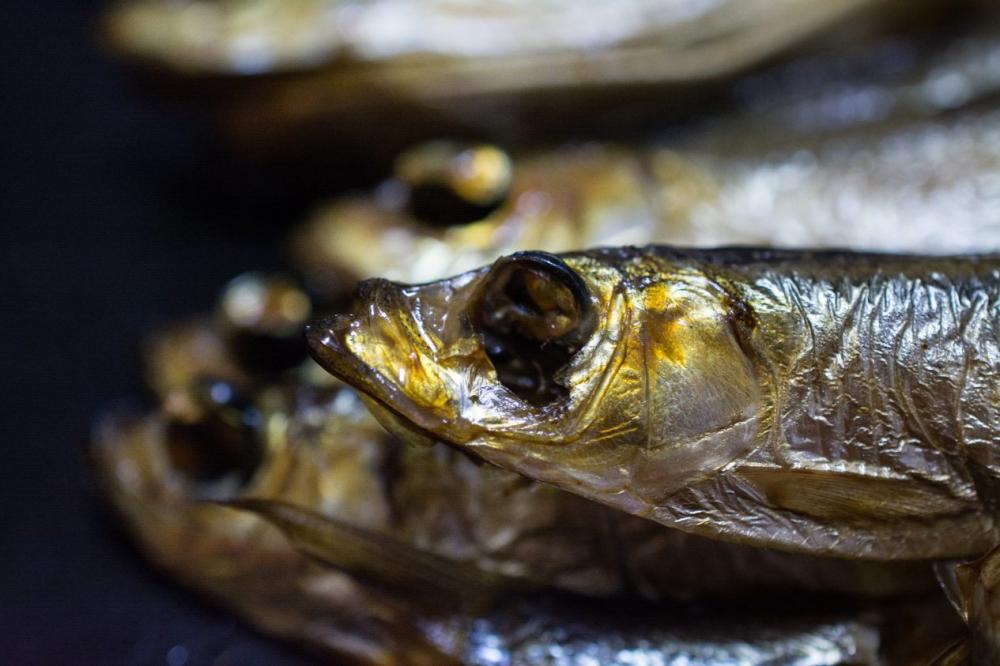 Smoked fish sprat head close up