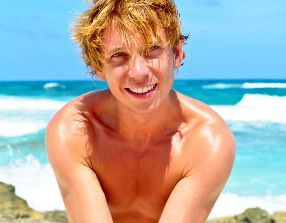 Tanned Blond Boy Showing Tattoo On A Beach