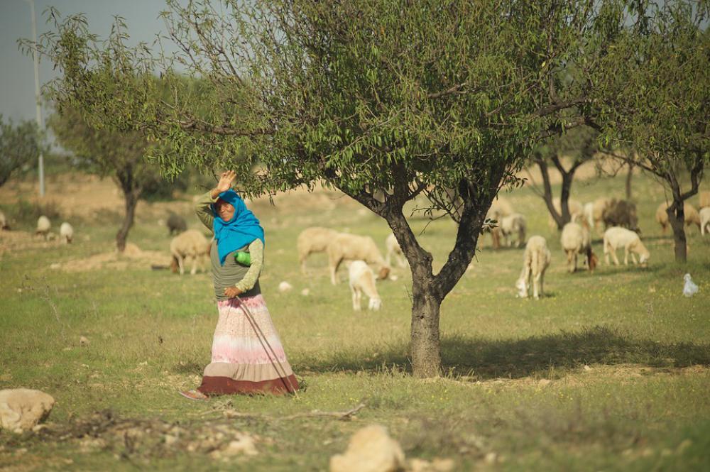 Tunisia Pasture Sheep Shepherd Woman Tree Almond