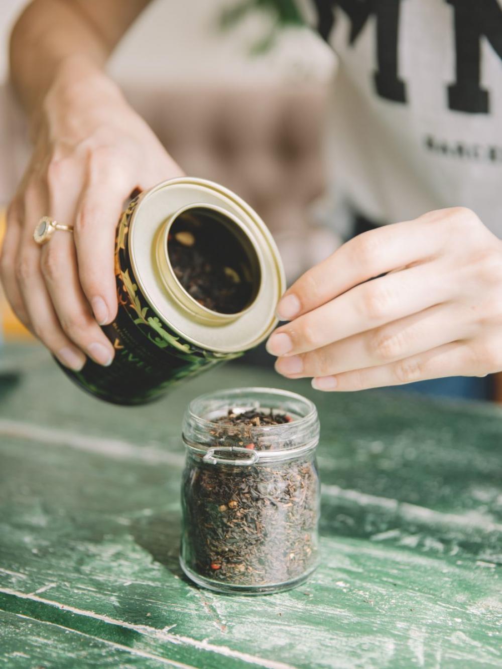 Woman filling glass container with tea leafs
