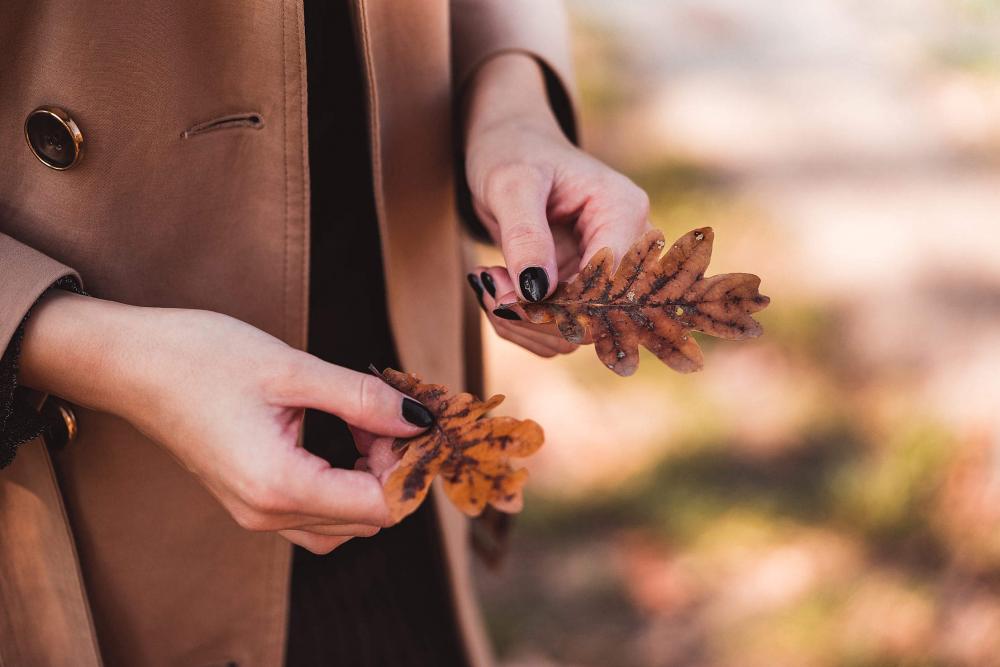Woman in Trench Coat Holding Autumn Leaves