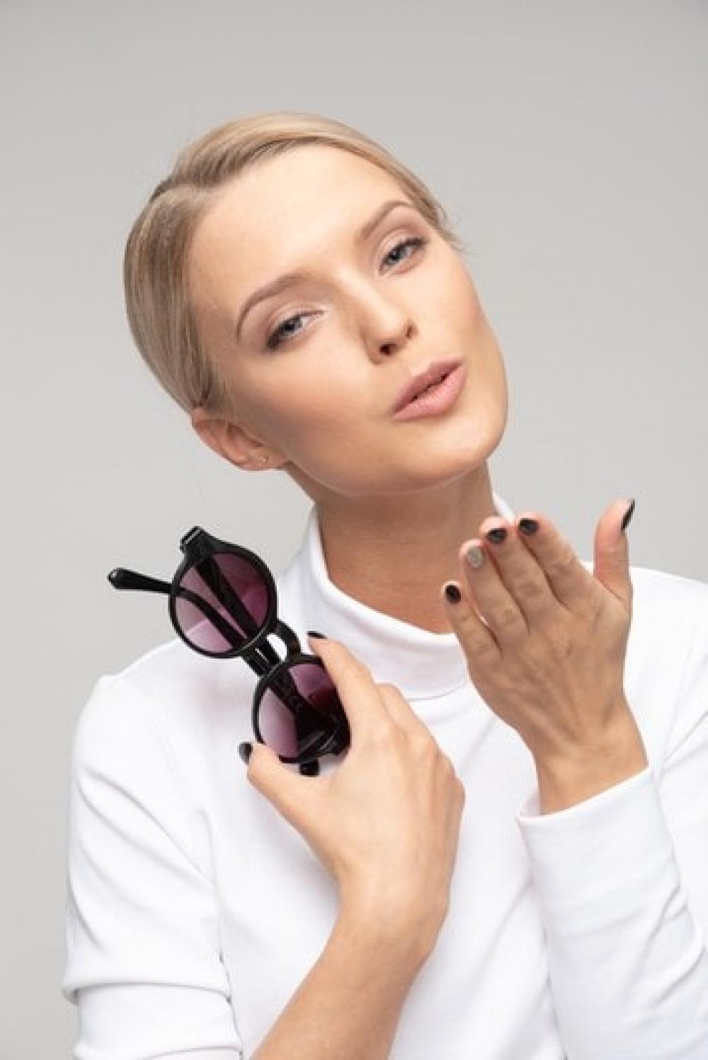 Young Attractive Woman Holding Sunglasses And Sending An Air Kiss
