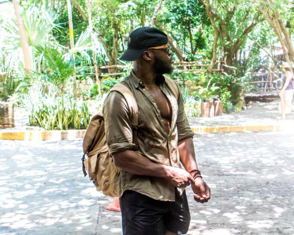 Young Man in Green Shirt and beige backpack - looking away